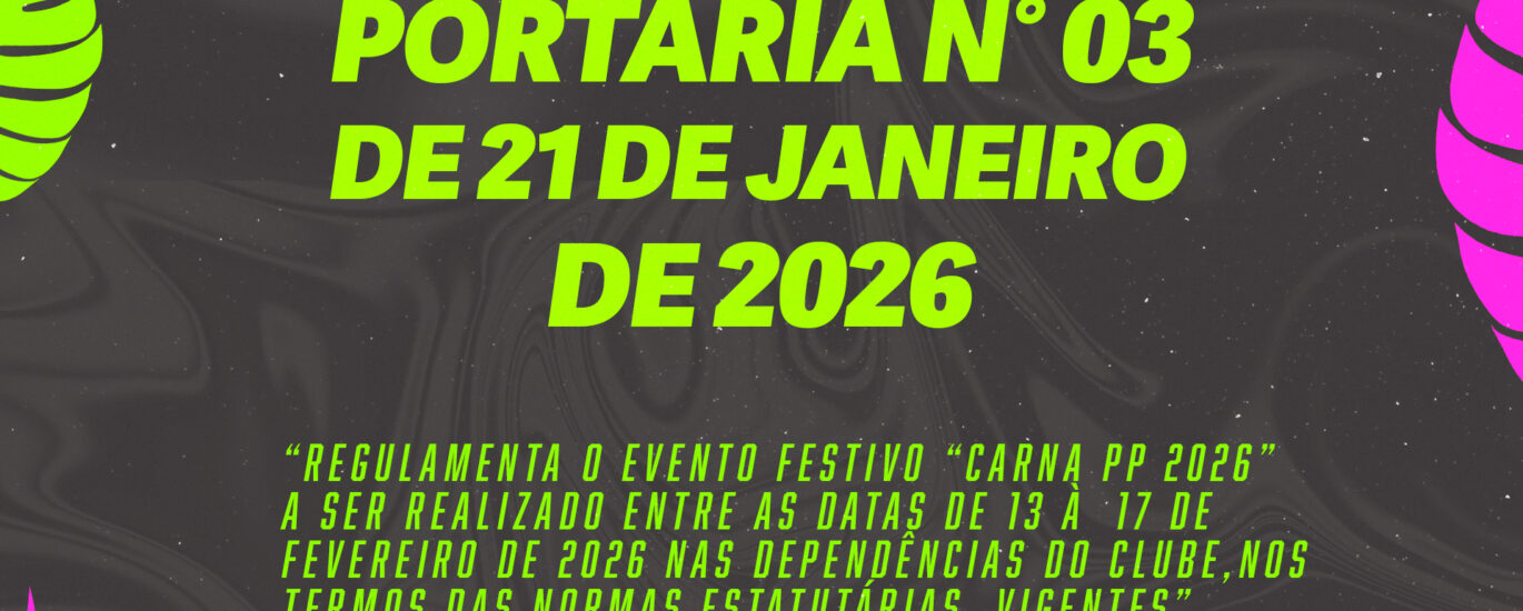 “Regulamenta o evento festivo “Carna PP 2026” a ser realizado entre as datas de 13 à 17 de fevereiro de 2026 nas dependências do Clube, nos termos das normas Estatutárias vigentes”