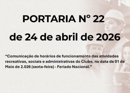 Notícias Notícias Destaques Últimas NotíciasPortaria Nº 022 Feriado 24 de abril 2026 28 abr, 2026 PORTARIA Nº 22 de 24 de abril de 2026 “Comunicação de horários de funcionamento das